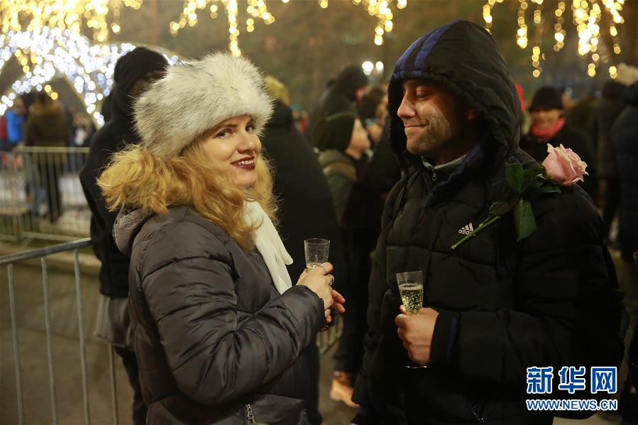 1月1日,在罗马尼亚布加勒斯特,一对情侣在跨年庆祝活动上喝香槟。 新华社发(彼得雷斯库摄)