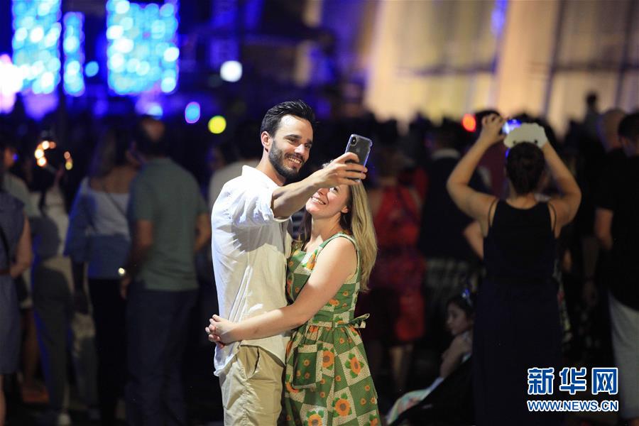 2018年12月31日,在澳大利亚堪培拉,一对情侣在跨年庆祝活动上自拍。 新华社发(潘翔越摄)
