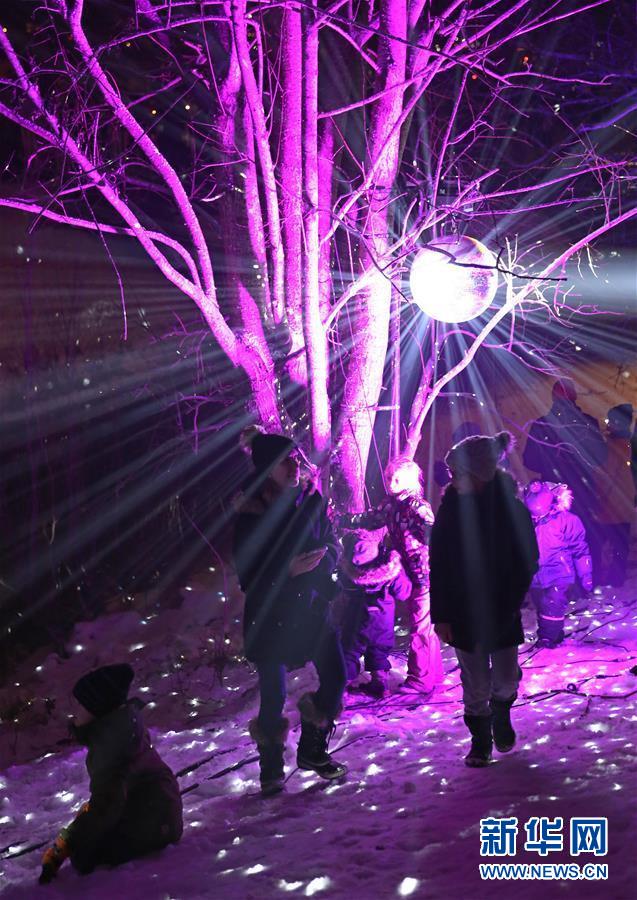 2018年12月31日,在芬兰南部城市埃斯波,人们在灯光点缀的公园内玩耍。