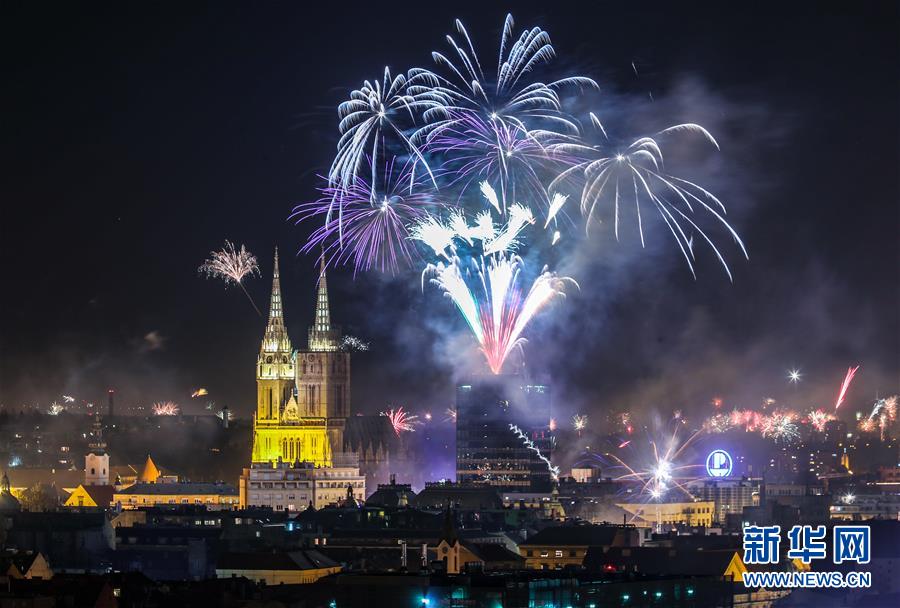 1月1日,在克罗地亚首都萨格勒布,人们在新年庆祝活动中燃放焰火。 新华社发(伊戈尔·克拉利摄)