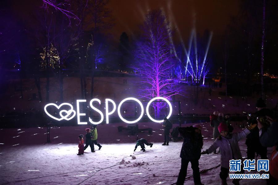 2018年12月31日,在芬兰南部城市埃斯波,人们在灯光点缀的公园内玩耍。