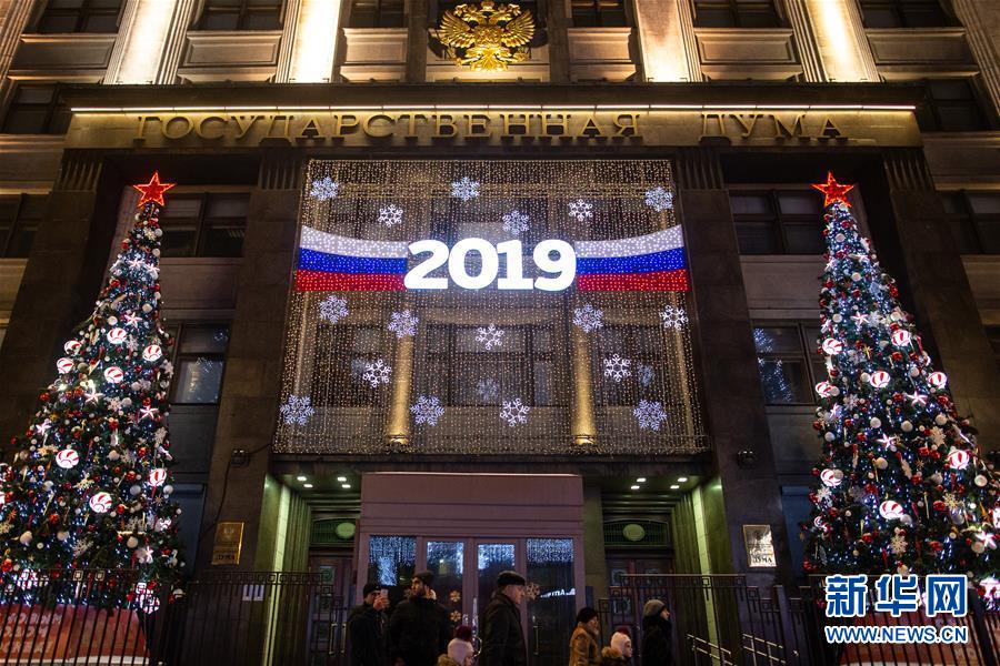 这是2018年12月31日在俄罗斯首都莫斯科拍摄的迎新年装饰灯。 新华社发(叶夫根尼·西尼岑摄)