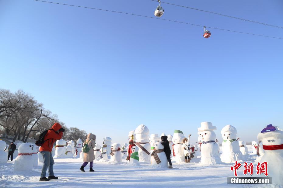 1月2日,游客与小雪人们合影。“雪人大观”日前亮相黑龙江哈尔滨松花江畔,2019个形态各异的雪人吸引市民和游客观赏、拍照。中新社记者 吕品 摄