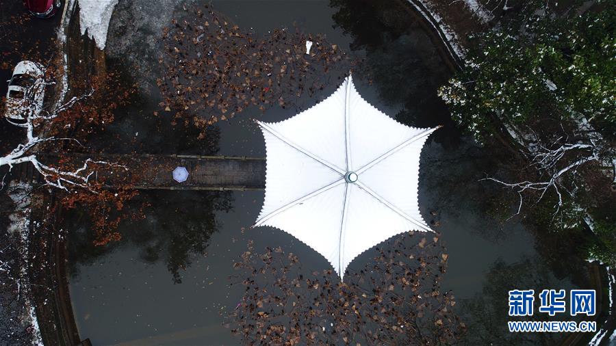 1月2日,一名游客撑着伞游览长沙市岳麓山脚下湖南大学内的吹香亭(无人机拍摄)。 新华社记者 李尕 摄