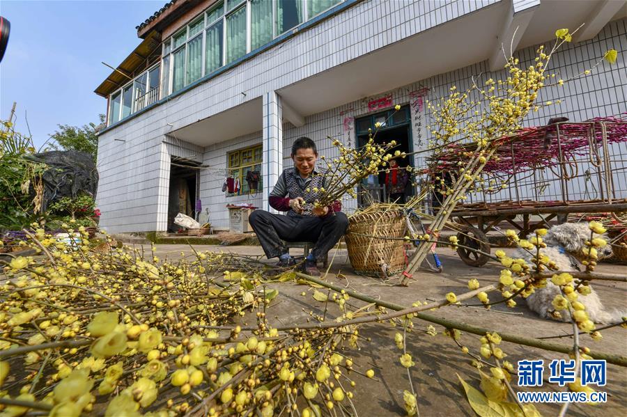 1月5日,在重庆市北碚区静观镇万全村,村民匡正华将采摘的腊梅绑成花束。 新华社记者 刘潺 摄