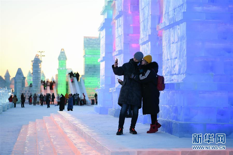 1月5日,游客在第35届中国·哈尔滨国际冰雪节主会场之一哈尔滨冰雪大世界园区自拍。 新华社记者 王松 摄