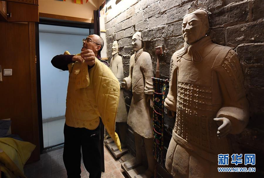 1月4日,兵马俑主题民宿经营者郭志华演示提供给住客体验的秦俑服装。 新华社记者 李一博 摄