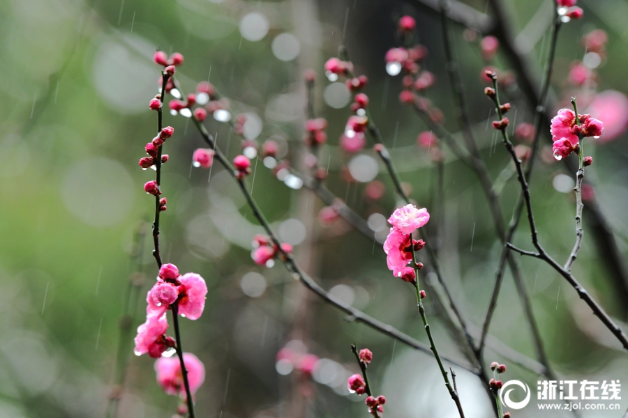 1月11日,杭城孤山梅花零星绽放,趁周末雨水暂停,可以去孤山寻梅了。(浙江在线拍友 里尔 摄)