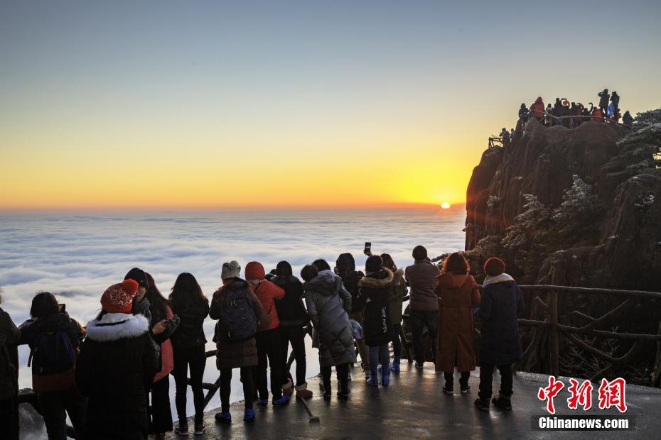 1月12日清晨,安徽黄山风景区迎来晴好天气,自黄山之巅向东眺望,一轮金日缓缓升起,红光万丈,气势恢宏。接着群峰之间,云雾铺陈,形成大面积云海景观,雾浪翻腾,金辉熠熠,吸引了许多游客登高观赏拍照。随着天光明亮,满山遍野的雾凇景观映入游客眼帘,一层层晶莹的玉衣披挂在奇松怪石之上,在日光照耀之下,银光闪烁,美不胜收。文/刘浩 图/叶永清