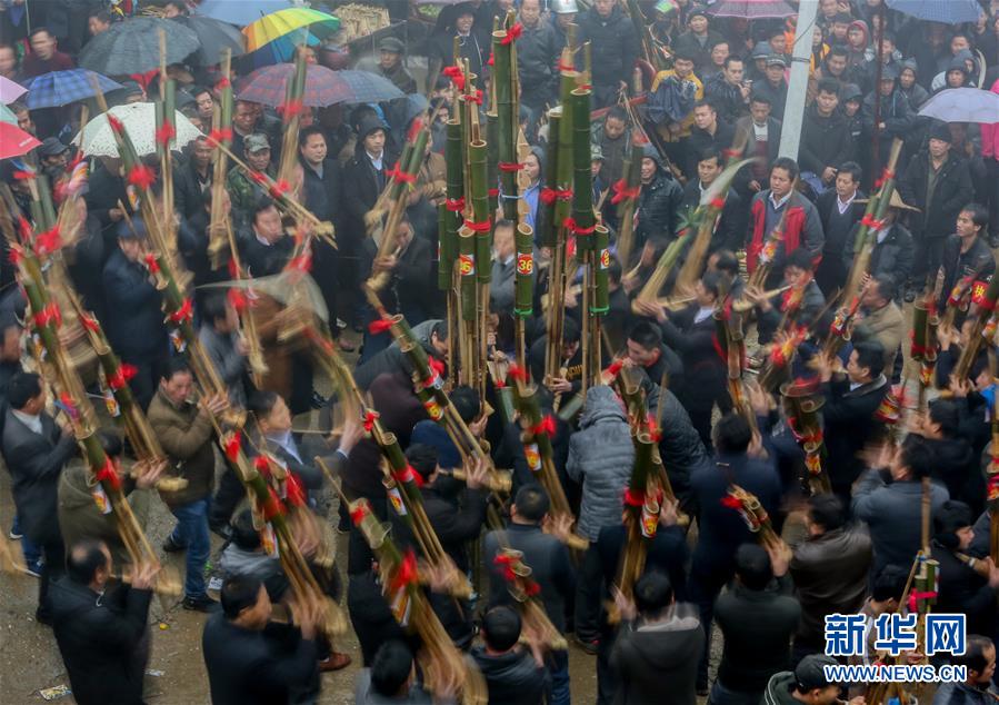 1月14日,人们在广西融水苗族自治县红水乡举行的芦笙节上赛芦笙。新华社记者 陈君清 摄
