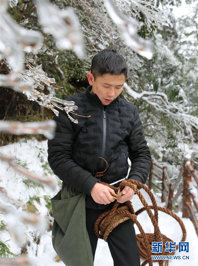 湖南张家界:冰雪下的悬崖清洁工