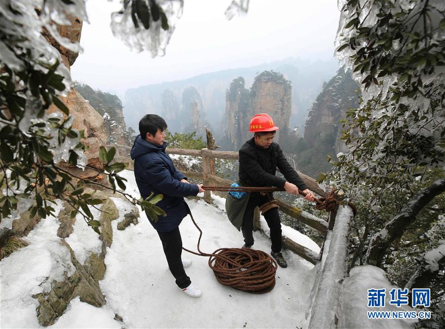 湖南张家界:冰雪下的悬崖清洁工