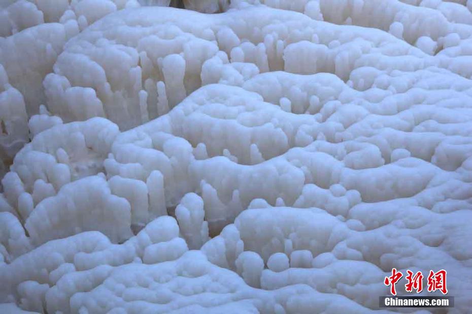 近日,甘肃白银市靖远县黄河虎豹口岸边宽300多米的山崖上,数十条高约15米左右,造型各异、色彩不同的冰瀑飞流直下。冬季,当地民众通过黄河岸边的提灌工程,将黄河水抽到坪上灌溉农田,多余的水通过山层砂岩渗出滴水成冰,顺势形成一条条冰挂和冰柱景观。张福昌 摄