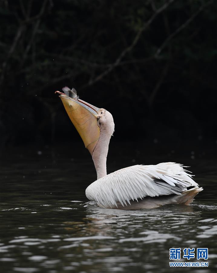 1月16日,白鹈鹕在鱼塘内觅食。 近日,在海口市琼山区龙泉镇定文村的一处鱼塘内有一群白鹈鹕嬉戏觅食。 新华社记者杨冠宇摄