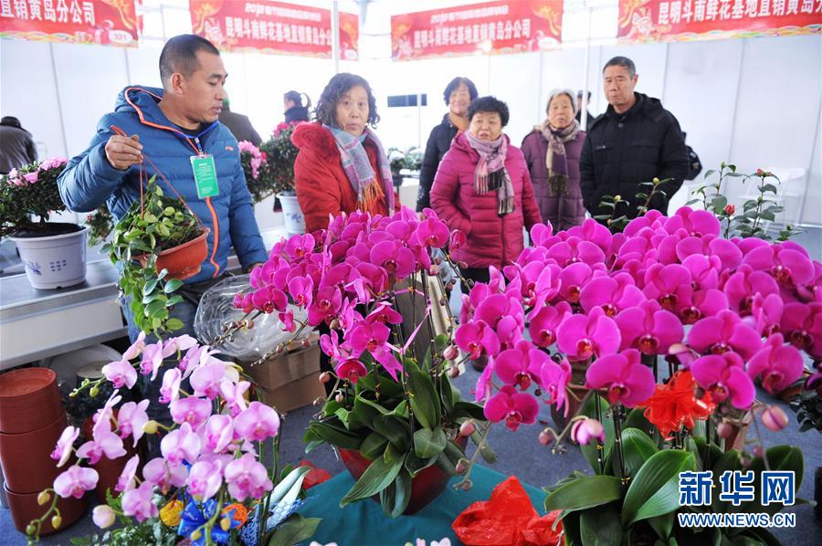 1月16日,在山东青岛西海岸新区金沙滩啤酒城,人们在展销会上选购鲜花。