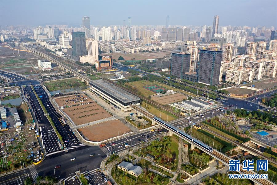 1月17日,温州市域铁路S1线在进行测试运行(无人机拍摄)。 由中国铁建铁四院总体设计的温州市域铁路S1线以高速动车组技术平台为基础,是全国首条采用交流25千伏同相供电制式的轨道交通线路,预计1月底投入试运营。 新华社记者 邢广利摄