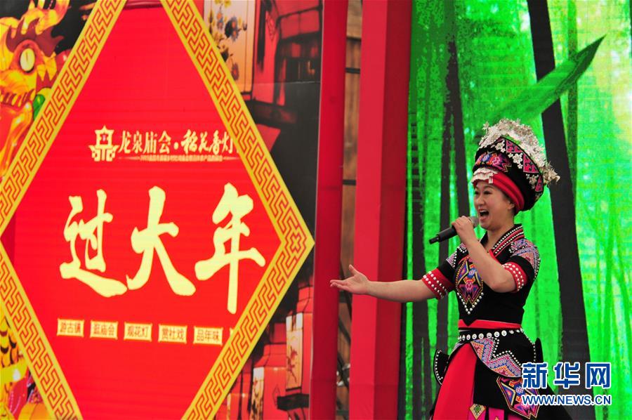 1月20日,在湖北省宜昌市夷陵区龙泉古镇,歌舞团演员在乡村社戏庙会上表演节目。 新华社发(张国荣 摄)