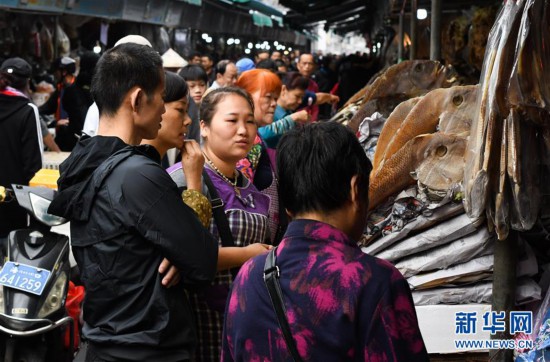 1月19日,在海口市东门市场,市民前来采购海干产品。 新春佳节将至,海口市民来到市场采买各种年货,准备迎接即将到来的春节。 新华社记者 杨冠宇 摄
