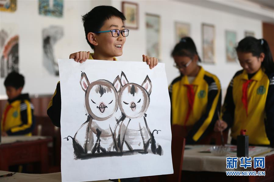 1月21日,山东青岛通济实验学校“国画社团”的小学生展示绘画作品。 当日,山东青岛通济实验学校举行“展才艺 迎猪年”为主题的才艺展示活动,学校泥塑、绘画、手工、书法、剪纸等课外社团的学生创作生肖猪题材作品,喜迎新春佳节的到来。 新华社发(梁孝鹏 摄)