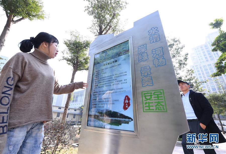 1月23日,福州市城区水系联排联调中心工作人员(左)介绍“水系智慧公示牌”展示的河长制相关内容。 为便于群众监督水系综合治理成效、培养爱河护河意识,近日,福建省福州市在市区试点布设“水系智慧公示牌”,实时监测并公示水质pH、溶解氧、浊度等参数,并展示水系治理、河长制工作、科普知识等内容。 新华社记者 林善传 摄