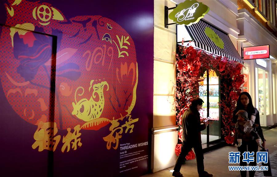 行人从香港街头的吉祥“猪”画旁走过(1月23日摄)。 农历猪年临近,香港街头装扮得流光溢彩,喜气盈盈。 新华社记者 吴晓初 摄