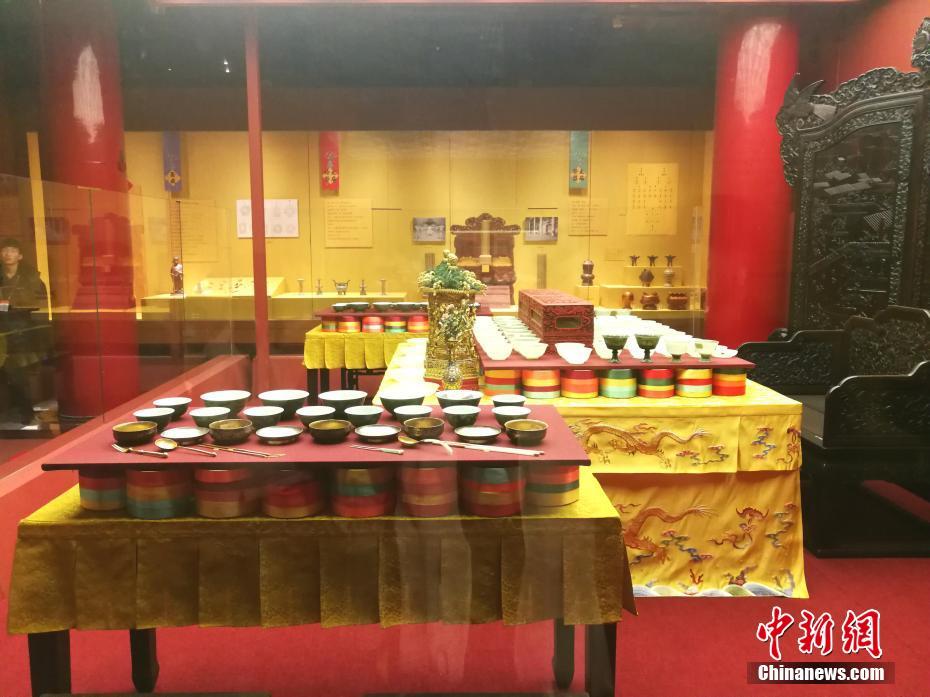 北京故宫举办“贺岁迎祥——紫禁城里过大年”活动,内容丰富吸引游客。图为1月23日,午门展览大厅中展出的故宫紫禁城迎新御膳器皿。中新社记者 关向东 摄