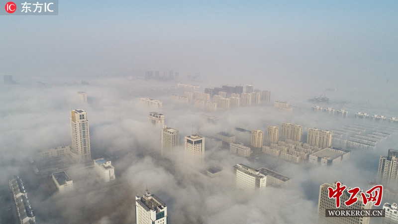 2019年1月24日,江苏省连云港市赣榆区平流雾景观(无人机拍摄)。 当日,江苏省连云港赣榆区上空出现平流雾景观,城市建筑在雾中若隐若现,宛如仙境。