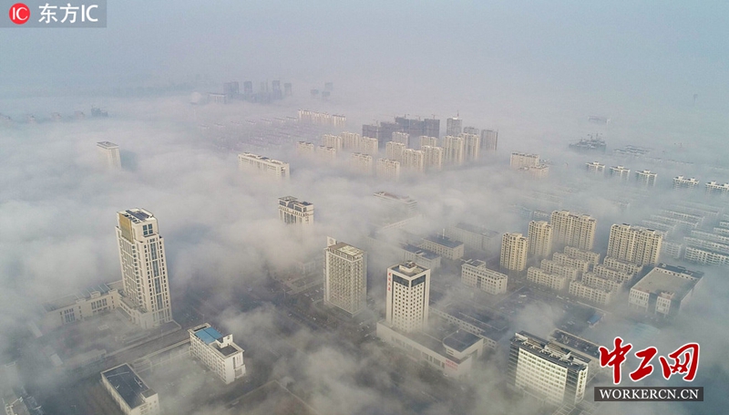 2019年1月24日,江苏省连云港市赣榆区平流雾景观(无人机拍摄)。(图片来源:东方IC)