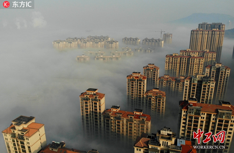 2019年1月24日,江苏省连云港市城区高层建筑在大雾中若隐若现,宛如海市蜃楼。(图片来源:东方IC)