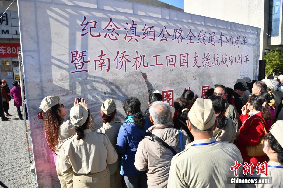 1月25日,纪念滇缅公路全线通车80周年暨南侨机工回国支援抗战80周年图片展在昆明市博物馆开展。来自云南各界的代表、南侨机工后人等齐聚一堂,共同缅怀历史。图为观众在背景墙上签名留念。中新社记者 刘冉阳 摄