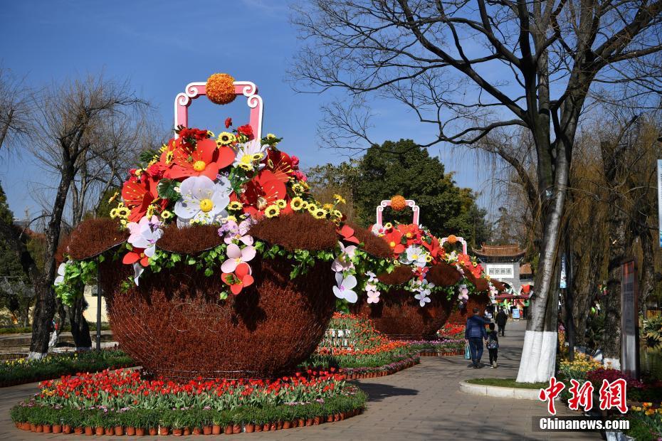 图为巨大的花篮和盛开的郁金香。中新社记者 刘冉阳 摄