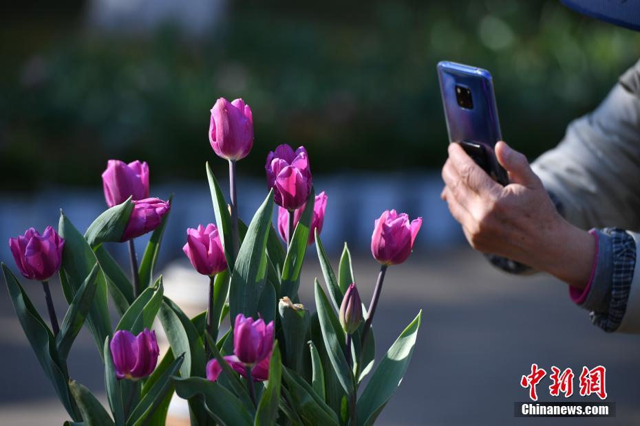 图为市民用手机拍下盛开的郁金香。中新社记者 刘冉阳 摄
