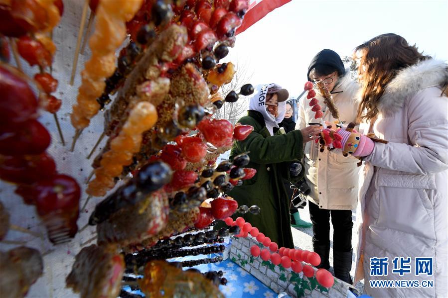 1月24日,在黑龙江省漠河市北极村,顾客在“最北糖葫芦”摊买糖葫芦。 新华社记者 王毓国 摄