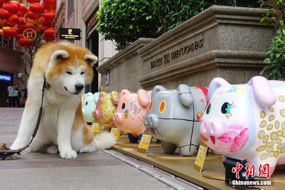 1月27日,新春临近,由香港存款保障委员会筹划的“存得安心?‘猪’事大吉贺新岁”艺术猪巡回展览在湾仔利东街展出。灵感来自“猪仔钱罐”的66只主题艺术猪由香港大专、中小学生及多名本地艺术家设计及参与制作,主办方希望通过艺术猪巡回展览,加深市民对存款保障计划的认识和了解。图为一只秋田犬与艺术猪“对视”。中新社记者 张炜 摄