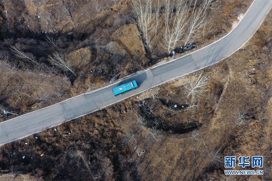 陈明强驾驶813路公交车行驶在济南南部山区(1月27日无人机拍摄)。新华社记者 王凯 摄