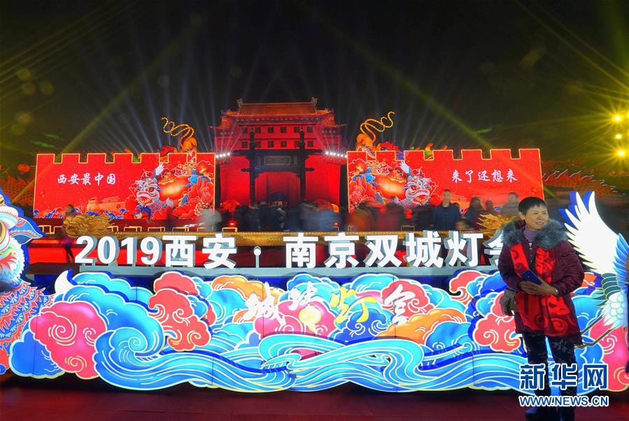 1月28日,游客在西安永宁门南广场的彩灯前留影。 1月28日晚,2019年西安城墙新春灯会在陕西西安明城墙开幕,五个灯区的万盏花灯璀璨绽放,把古都装点得金碧辉煌。 新华社发(贾吉平 摄)