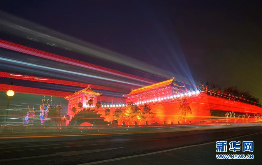 1月28日拍摄的西安永宁门夜景和彩灯。 1月28日晚,2019年西安城墙新春灯会在陕西西安明城墙开幕,五个灯区的万盏花灯璀璨绽放,把古都装点得金碧辉煌。 新华社发(贾吉平 摄)