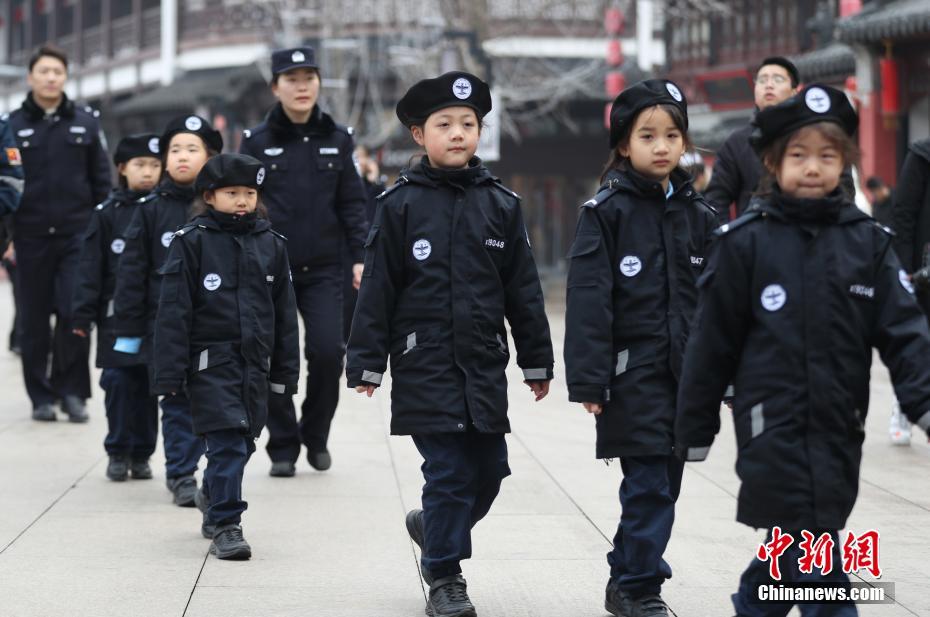 1月29日,来自江苏少年警校的小警员走进南京夫子庙地区,跟随南京市公安局秦淮分局民警出勤巡逻,体验节假日基层民警的日常工作,并向游客宣传相关安全知识。中新社记者 泱波 摄