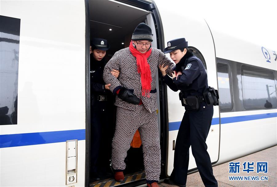 1月29日,合肥铁路公安处乘警支队女警谢肖鹏(右)、周丹琳帮助特殊旅客下车。 新华社记者刘军喜摄