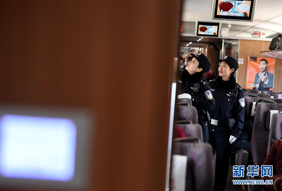 1月29日,合肥铁路公安处乘警支队女警谢肖鹏(左)、周丹琳在一辆高铁上开展治安巡查。 新华社记者刘军喜摄