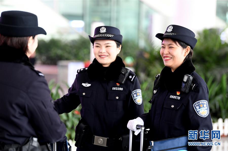 1月29日,合肥铁路公安处乘警支队女警谢肖鹏(中)、周丹琳(右)在合肥南站与同事交流。新华社记者刘军喜摄
