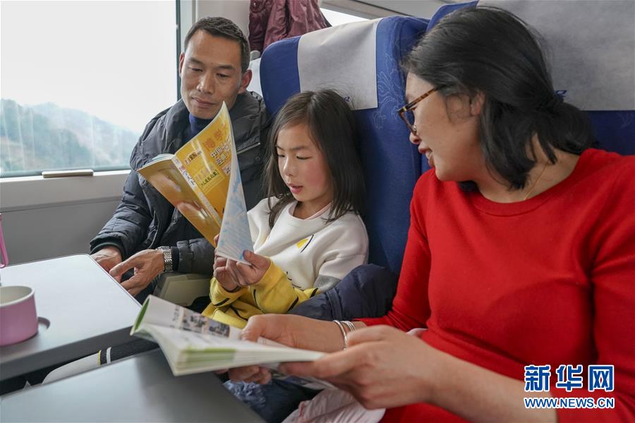 1月29日,在G2883次列车上,响应倡议的家长带着孩子一起读书。