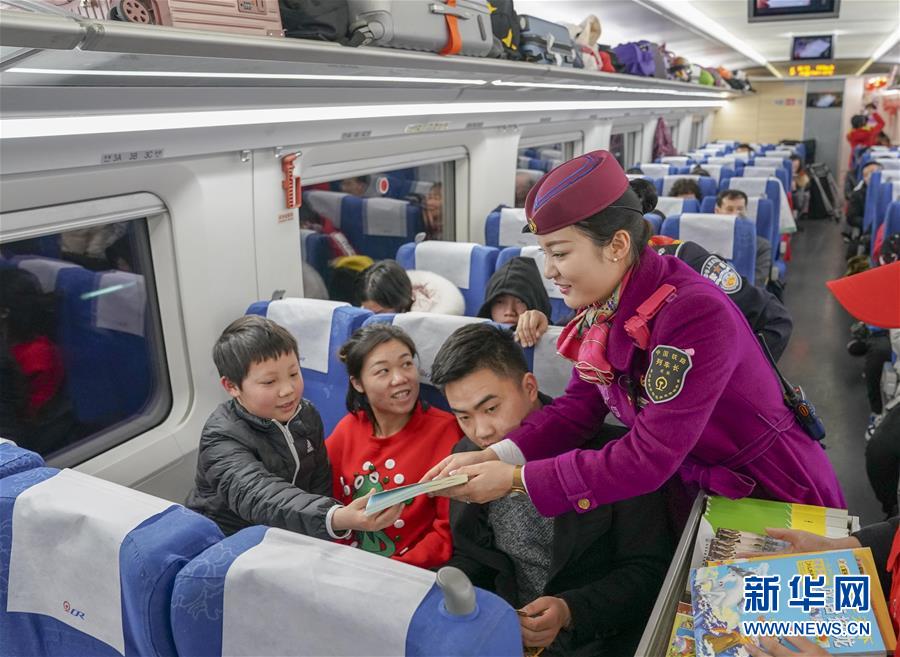 1月29日,在G2883次列车上,列车长和青年志愿者一起在车厢里向乘客推荐书籍。 新华社记者 刘潺 摄