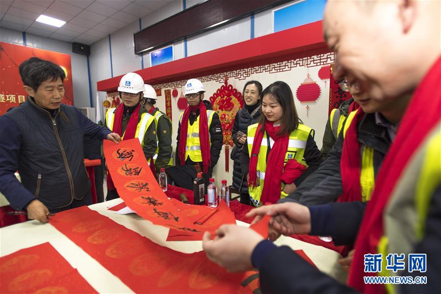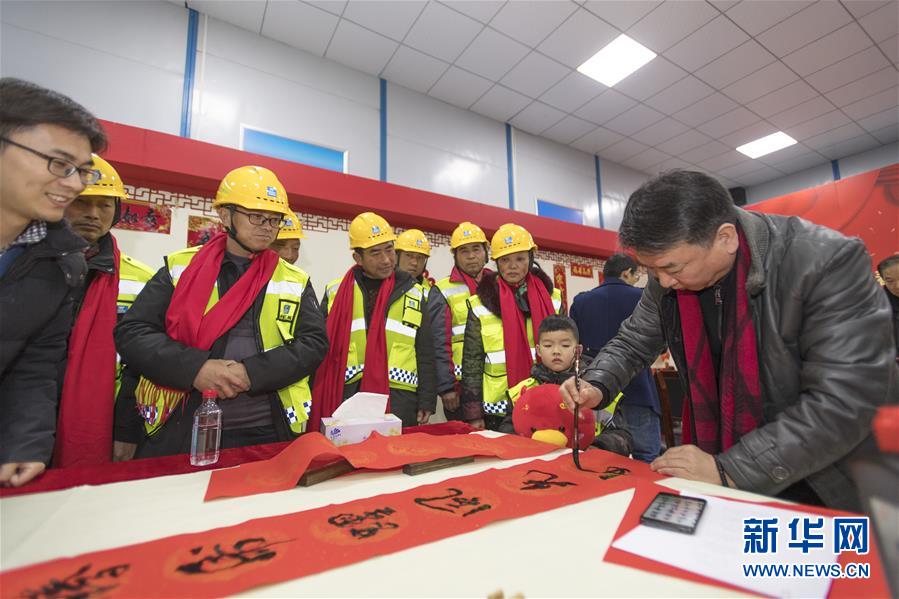 1月29日,湖北省书法家协会会员为中建三局基础设施公司职工书写春联。 当日,湖北省文联组织省书法家协会会员走进中建三局武汉大东湖核心区污水传输系统工程项目现场,开展新春“送文化 送温暖”慰问活动,为项目职工现场书写春联,并送上节日慰问品,传递美好节日祝福。 新华社记者 熊琦 摄