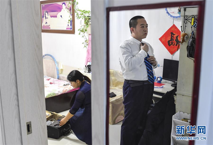1月28日,在出发执行K1024次列车任务前,李长明在家中整理着装,他的妻子陈松在卧室为他收拾行李。新华社记者 许畅 摄
