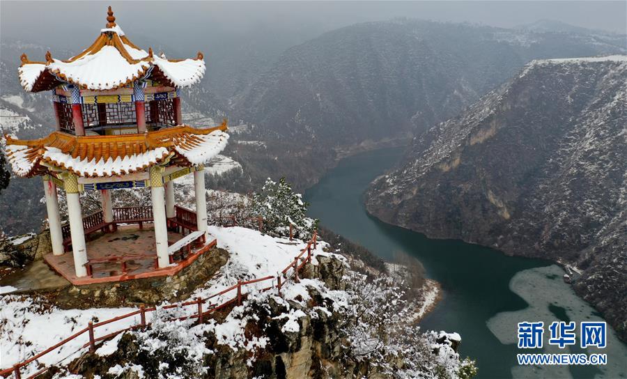 这是卢氏县双龙湾风景区的雪景(1月31日无人机拍摄)。 卢氏县地处河南省西部山区,生态优美,环境宜人。近日,卢氏县迎来降雪天气,雪后的豫西山区银装素裹,分外妖娆。 新华社记者 李嘉南 摄