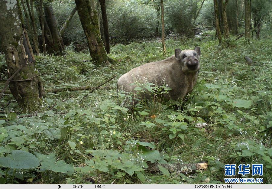 这是在保护区内布设的红外相机拍摄的野猪活动影像(2018年8月18日摄)。 近日,甘肃白水江国家级自然保护区工作人员在整理2018年全年红外相机资料时,发现包括野生大熊猫、羚牛、金丝猴等多种野生动物频繁出没的影像。据介绍,2018年,该保护区共布设红外相机700台(次),收回各类野生动物有效红外视频8350多段、照片15800多张,通过分析研究监测影像,基本掌握了野生大熊猫等珍稀动物活动情况和种群分布状况,野生动物种群相比2017年呈现稳中有升的态势。 新华社发