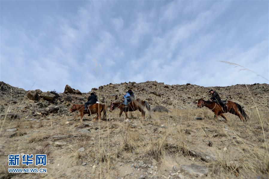 在昭苏县阿合牙孜冬季牧场,杰恩斯·阿里别克(左)带领牧业医院的医生骑马前往山顶一户牧民家中巡诊(1月31日摄)。 新华社发(丁磊 摄)