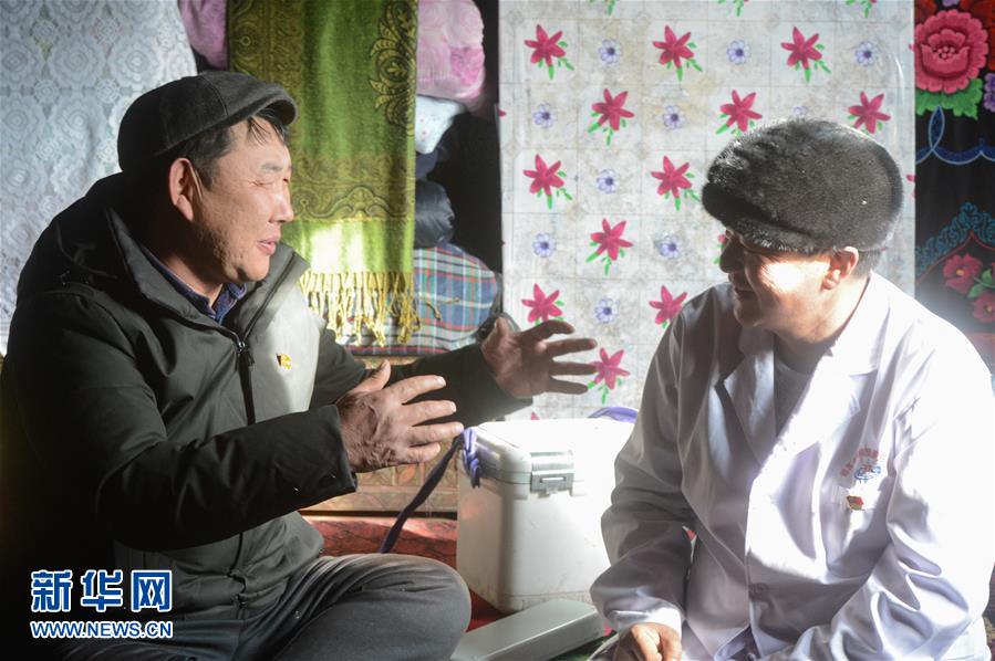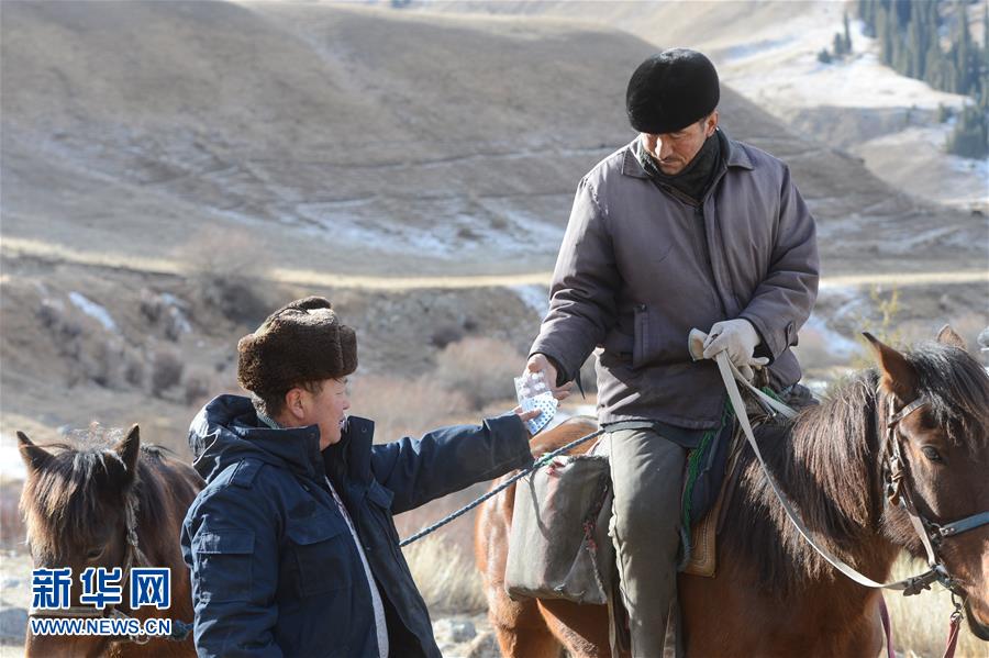 在昭苏县阿合牙孜冬季牧场,杰恩斯·阿里别克(左)为牧民马木台·俄哈甫送去药品(1月31日摄)。 新华社发(丁磊 摄)
