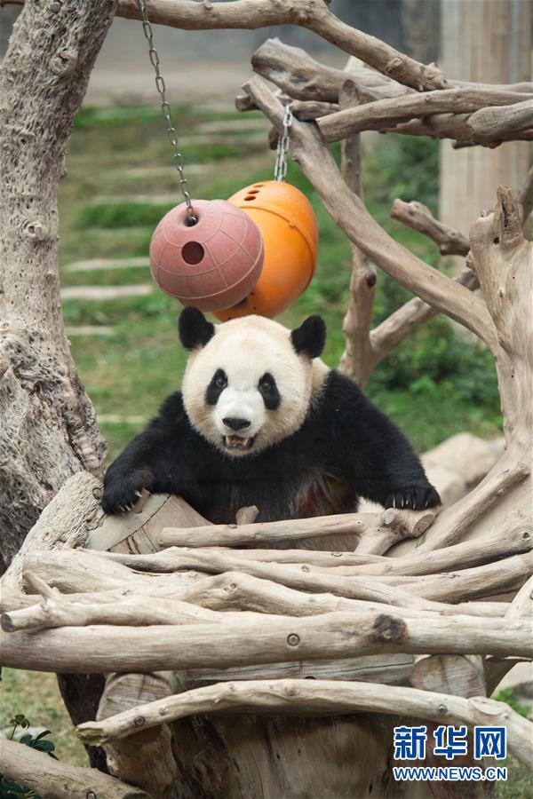 2月5日,大熊猫“健健”在玩耍。 2月5日至10日,澳门市政署举办“开心健康来拜年”活动,期间澳门大熊猫馆免费对公众开放。新华社记者 张金加 摄
